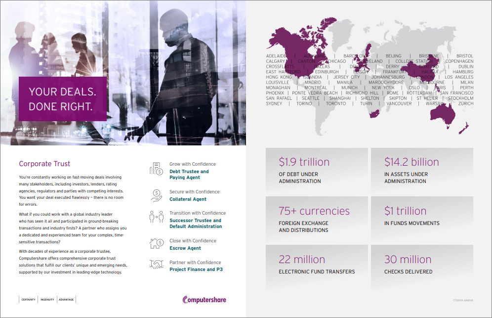Computershare Corporate Trust is a global industry leader with decades of experience as a provider of trustee and agency services for private and public market companies as well as governments and institutions.